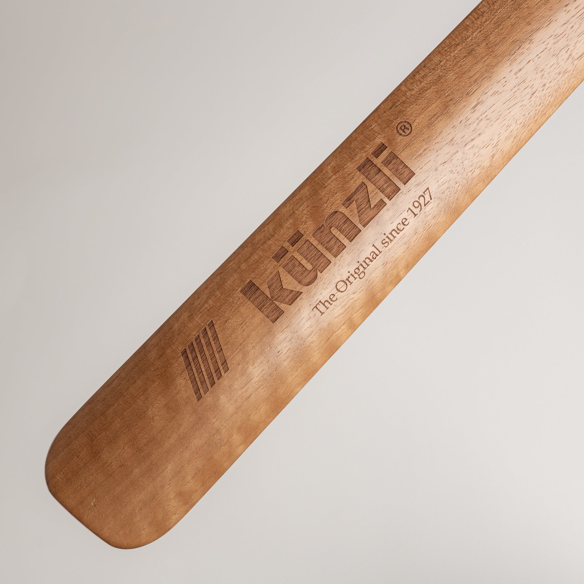 Shoehorn with Künzli logo, made of Swiss wood. Entirely crafted from walnut. The 50 cm length makes putting on shoes easier and protects your back.